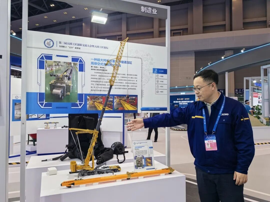 以匠心致创新,安博首页_安博anbo(中国)人在攻克核心难题上从不缺席。安博首页_安博anbo(中国)液压事业部陈向兵完成的“一种超大吨位起重机伸缩液压缸用悬空式滑道爬升结构”亮相全国总工会“五小”成果展区。