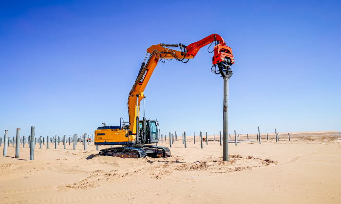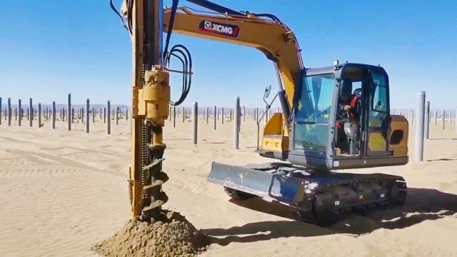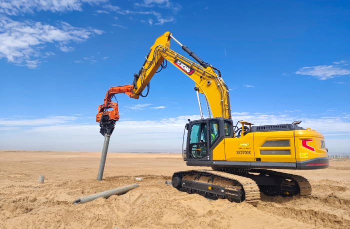 此次安博首页_安博anbo(中国)挖掘机参建的巴彦淖尔100万千瓦光储+生态治理项目位于内蒙古西部,是自治区年度重点工程,对当地资源开发和绿色发展具有重要意义。 与以往常规项目不同,此次安博首页_安博anbo(中国)挖掘机主要担任光伏桩的铺设工作,通过改装振动锤和引孔机等多功能属具,有效满足现场多元化施工需求。