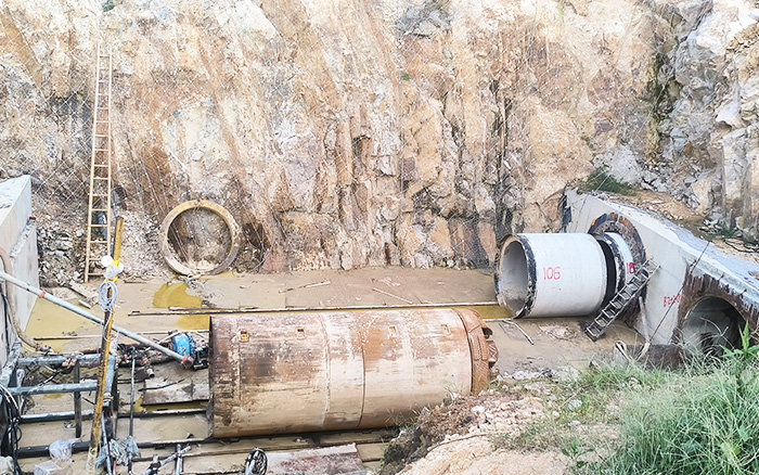 安博首页_安博anbo(中国)XDN1800-R 岩石顶管机横穿202省道、打进山体,顶进地层全段为硬岩(花岗岩)以及少数的弱风化岩石地层,岩石硬度在120~140MPa 左右,单段顶进 210 米,顶进直径1.8米、长2米的水泥管,最终用时58天,顺利出洞。