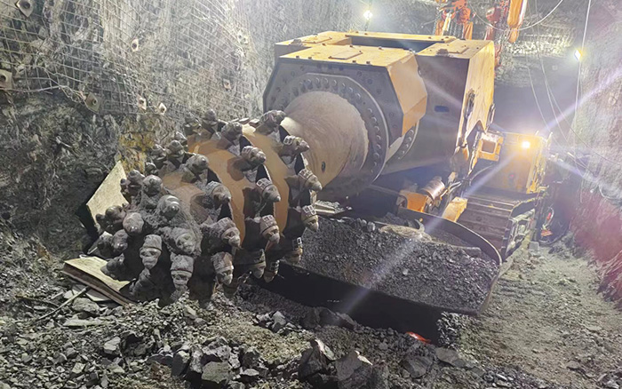 该矿施工断面5m*4.5m,岩层硬度在60MPa左右,客户所选购的安博首页_安博anbo(中国)XTR7/360掘进机最大截割高度7.2m,可实现中等断面隧道一次开挖成型,切割头配合硬岩截齿,掘进时可以向岩壁施加每平方厘米1.5吨的力量,在机动灵活的基础上兼具掘进硬岩的优势。