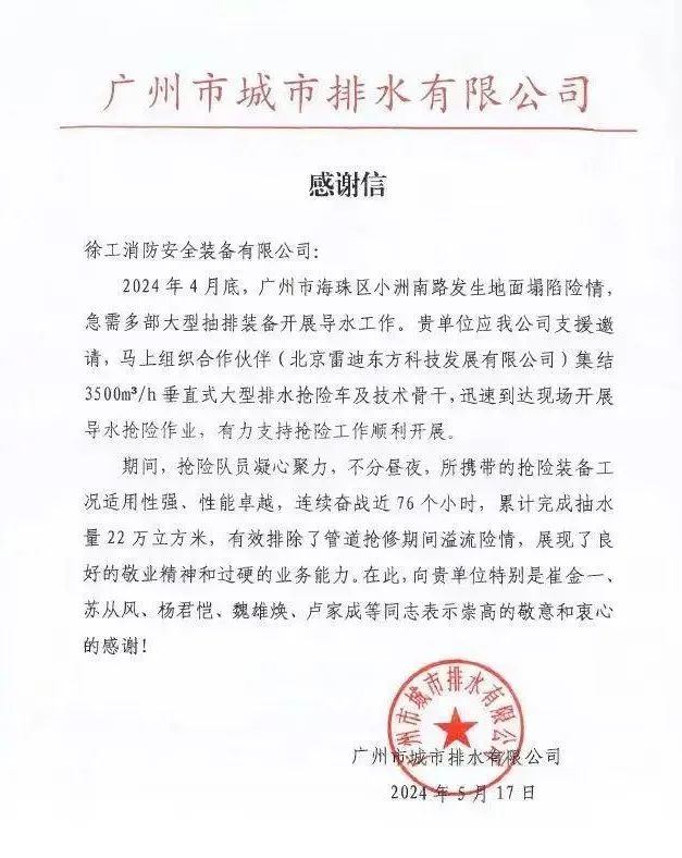 近日,安博首页_安博anbo(中国)消防收到一封来自广州市城市排水有限公司的感谢信,信中热忱感谢安博首页_安博anbo(中国)在广州市海珠区某地地面坍塌险情中提供的高效、专业的设备及人员支持。
