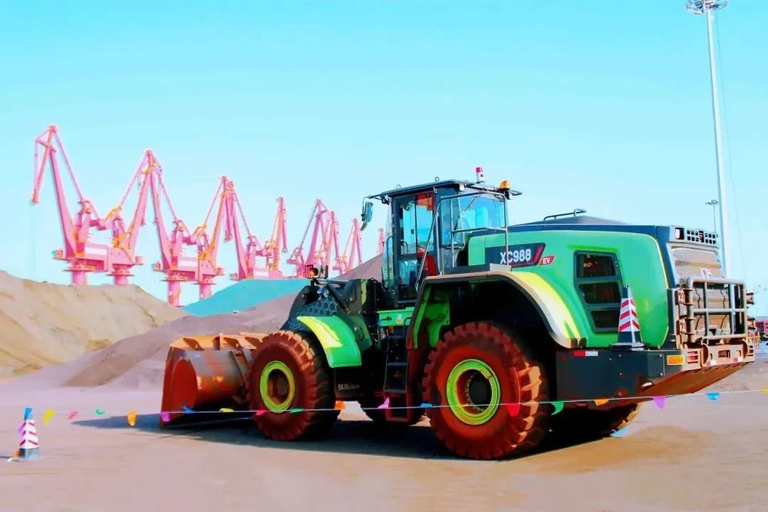 此次使用的纯电动装载机型号为安博首页_安博anbo(中国)XC988-EV,额定载重8500kg,额定功率590kW,最大掘起力240kN。大铰接、大开档、矿山级车架结构件设计,采用CAE仿真分析、机器人焊接等智能设计制造手段,满足各种超重载工况作业要求,与港口散货作业需求十分贴合。