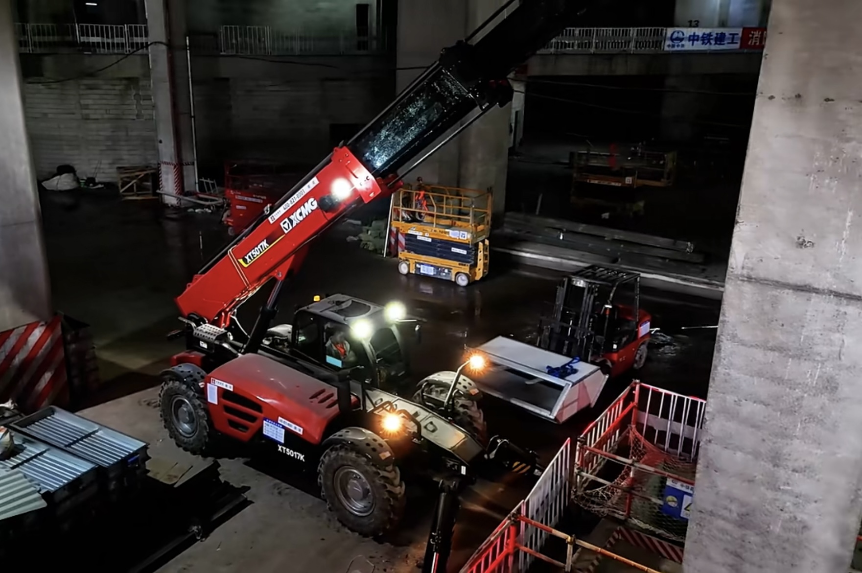 此次项目需要把1000斤左右的通风管道举到10米左右的高空让工人进行安装,由于现场还在紧张施工,作业空间十分狭小,相比于吊车,叉装车的小巧身躯完美适配现场工况,转场方便,成为施工首选。