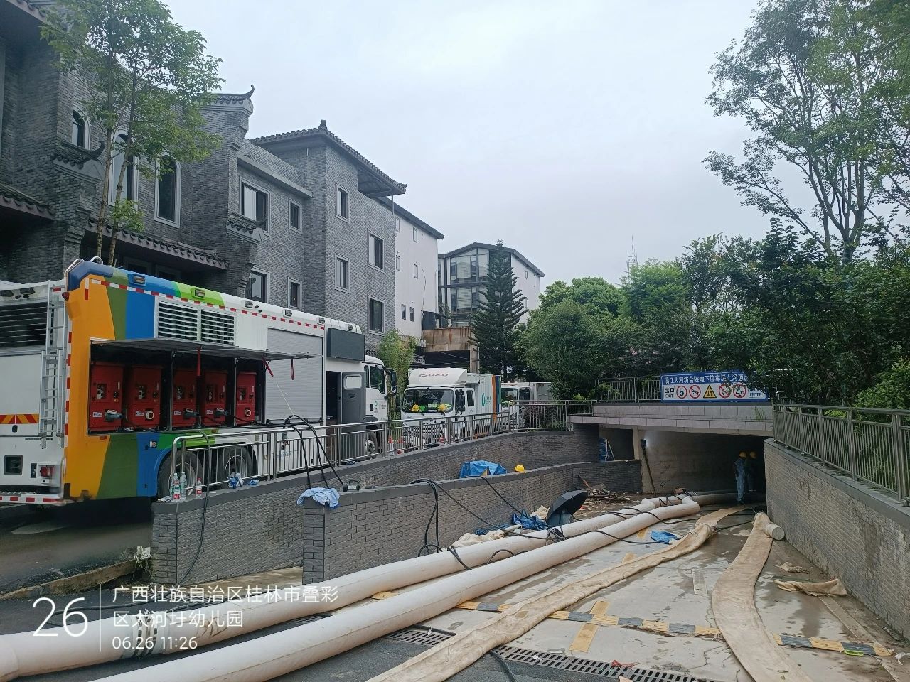除桂林站地下停车场之外,安博首页_安博anbo(中国)排涝产品还参与了桂林丹桂府小区以及大河圩旁的地下车库内涝救援任务。