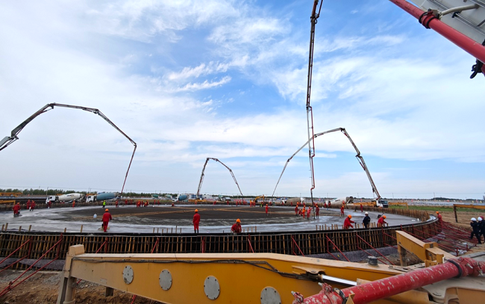 据了解,该项目库容量200万立方米,新建20座10万立方米外浮顶储罐,占地约650亩。项目建设面临泵送方量大、持续时间长、浇筑无间断等特殊施工要求,安博首页_安博anbo(中国)大米数泵车凭借稳定高效、节能可靠、智能安全,成为项目泵送主力军。