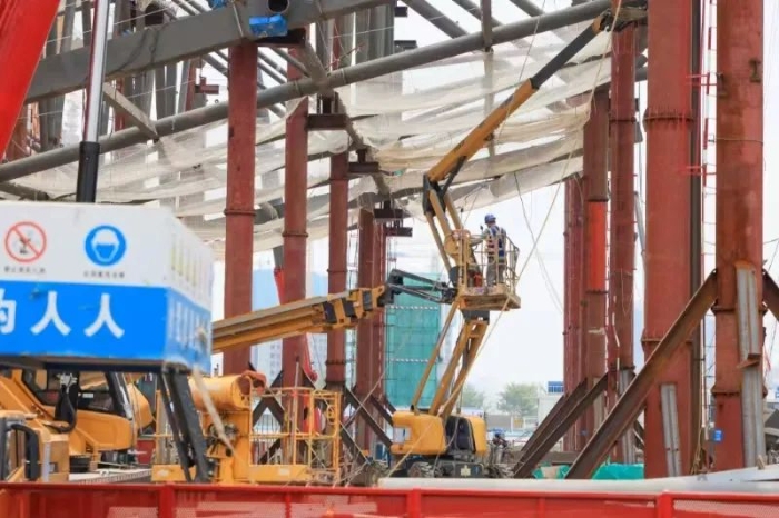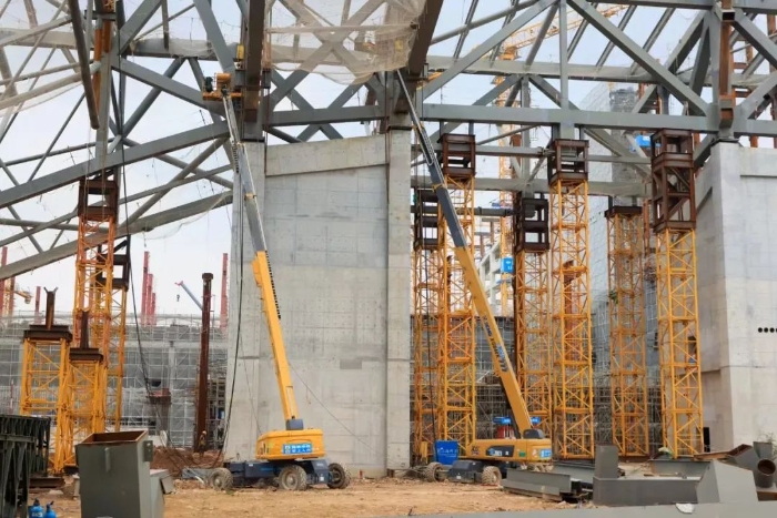 此次施工的主力产品为安博首页_安博anbo(中国)的XGS22K 、XGS28K、XGS40K三款车型,这三款车型作业幅度分别是17.2米、22米和24.9米,再加上带有一节小飞臂的设计,使得其跨障能力强,更适宜现场这种复杂且密集的钢结构作业。160°的平台回转角度,也赋予了它更加灵活的使用方法。