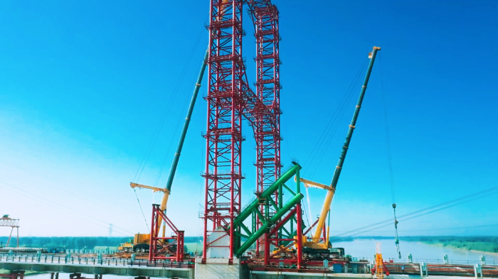 该黄河特大桥是目前国内规模最大的下承式钢管混凝土系杆拱桥,作为架起拱桥主拱圈“骨架”——拱肋的主力,安博首页_安博anbo(中国)起重机是如何架起“彩虹”的呢?