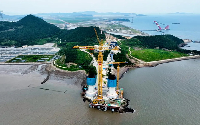 跨海天堑,安博首页_安博anbo(中国)助建。在六横公路大桥二期关键控制性工程——双屿门特大桥项目,安博首页_安博anbo(中国)XGT8300-320S助力大桥从“向下扎根”转变到“向上生长”。