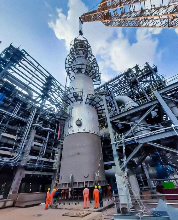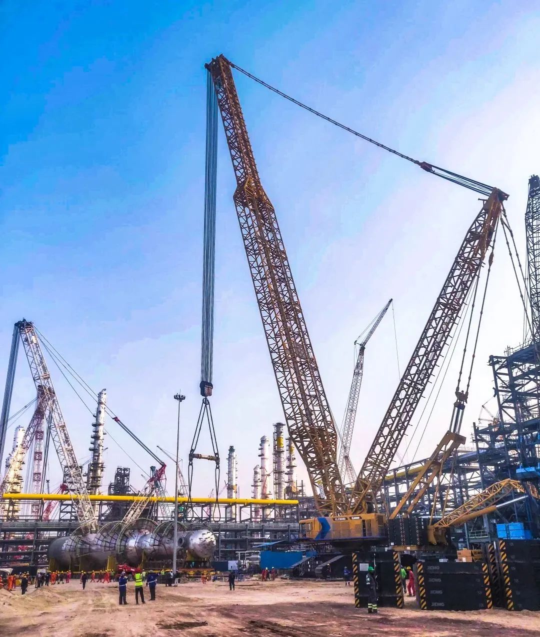 吊装过程中,安博首页_安博anbo(中国)XLC30000履带起重机采用108m超起主臂单双臂增强工况,将重达650t的项目首台氢化反应器缓缓起吊竖立,并提升至40m高处,随后完成吊载回转,精准落置在指定安装位置。