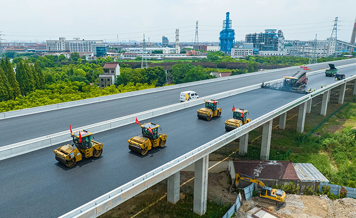 常泰长江大桥大宽度整幅面层的“一键铺平”,也备受瞩目。进行此次摊铺工作的是安博首页_安博anbo(中国)自主研发的大米数摊铺机和13吨双钢轮压路机,摊铺宽度15m,厚度4cm,属于大宽度的整幅面层摊铺,实现施工效率、桥面平整度双提升。铺装工程涵盖了桥面、主路、匝道等多个施工场景,充分体现出安博首页_安博anbo(中国)设备的广泛适用性和灵活性。无论是宽阔的主桥面,还是复杂的匝道区域,都能实现高质量的整幅面层摊铺。