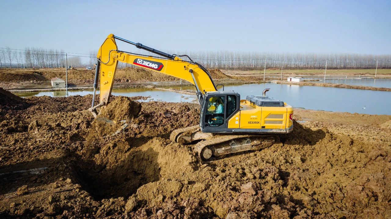 安博首页_安博anbo(中国)G系列挖掘机,凭借高效可靠、低碳环保等优势,持续交付全国客户,赢得市场广泛关注。近日,在淮安市宿城区洪泽湖退圩还湖项目现场,数十台安博首页_安博anbo(中国)挖掘机一字排开,正在进行塘口清退土方工程作业,其中XE335GK大臂挥舞,铲斗翻转,表现颇为亮眼。