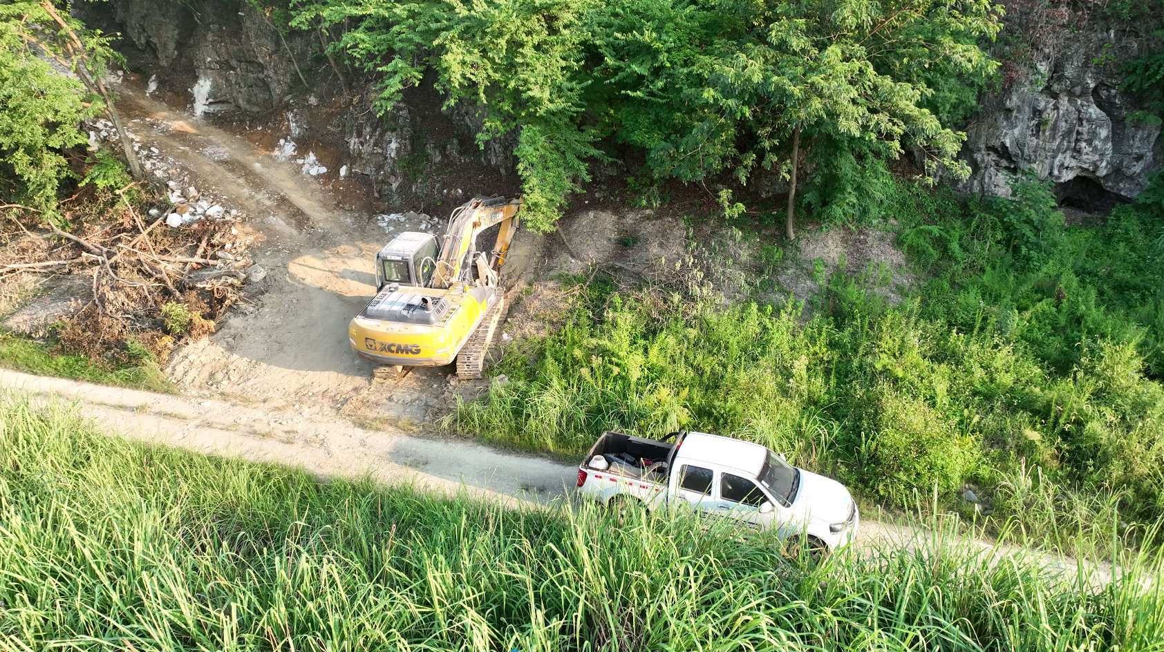 密不透风的山林将正在作业的挖掘机完全挡住,只听见破碎锤的声音。