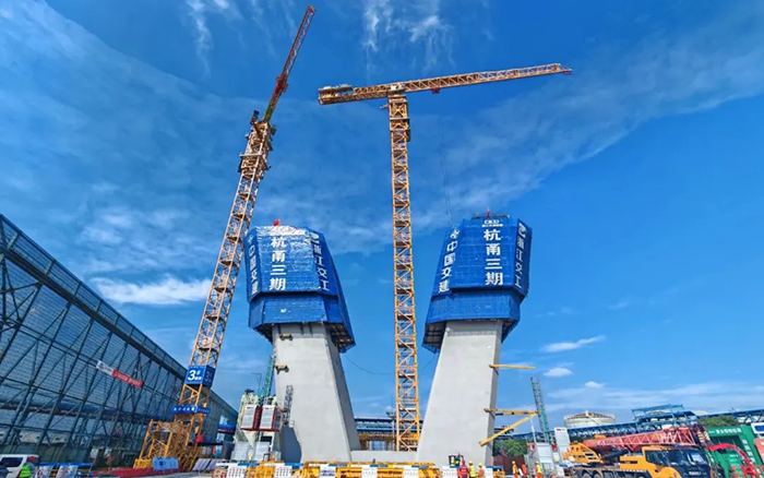 大独立高度、少附着、大悬高,本次参建的安博首页_安博anbo(中国)XGT3000起升功率大、动力强劲、作业效率高。同时应用H型钢杆片式标节,承载能力强、防腐性能好,高度匹配大桥“流水线”生产的成套化、智能化建设。