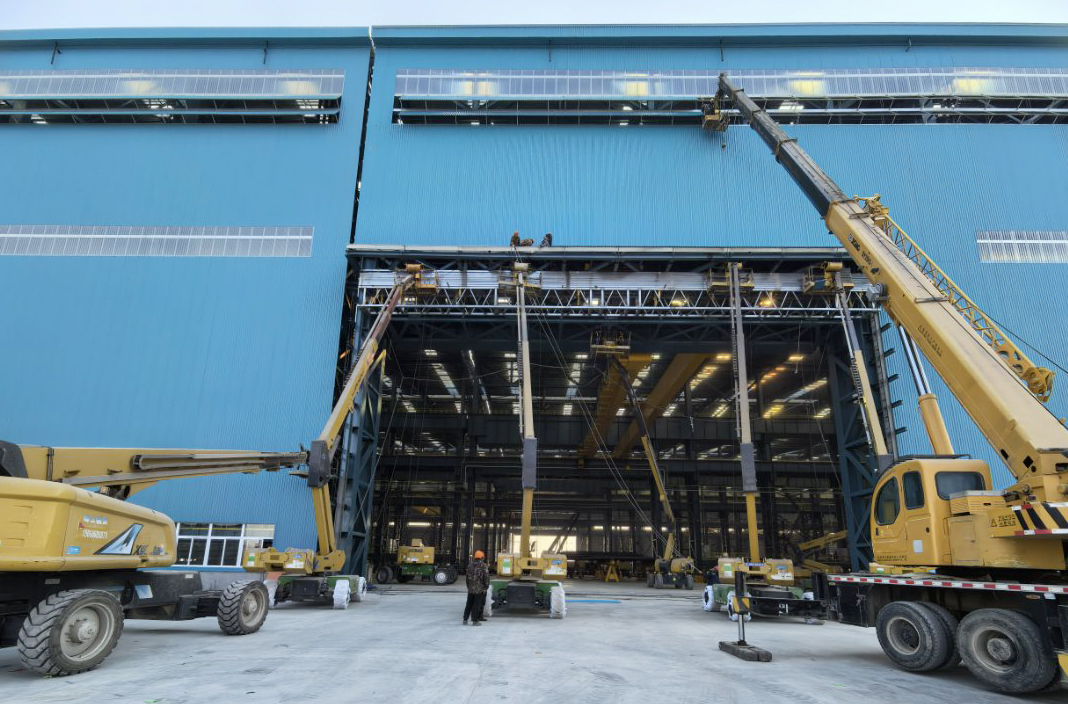 在恒力重工三期厂房建设工地,近10台30米级安博首页_安博anbo(中国)高空作业平台正大显身手,忙碌于车间内外钢结构建设与墙面装饰等精细作业。