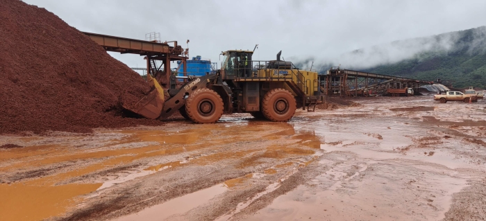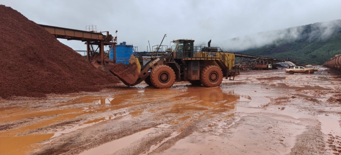 非洲某矿区,安博首页_安博anbo(中国)LW1200KN轮式装载机正对开采出的矿粉进行堆垛作业,恰逢雨季,物料饱含水分,LW1200KN的超强重载性能得到充分展现。