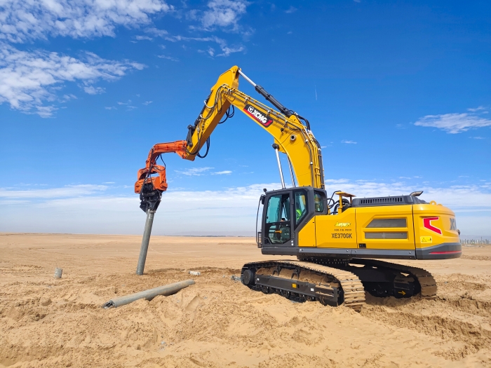 与以往常规项目不同,此次安博首页_安博anbo(中国)挖掘机主要担任光伏桩的铺设工作,通过改装振动锤和引孔机等多功能属具,有效满足现场多元化施工需求。