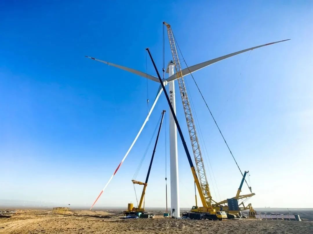 西北戈壁10万千瓦风电项目现场,安博首页_安博anbo(中国)轮履产品集聚,上演着多机协同的吊装攻坚战。