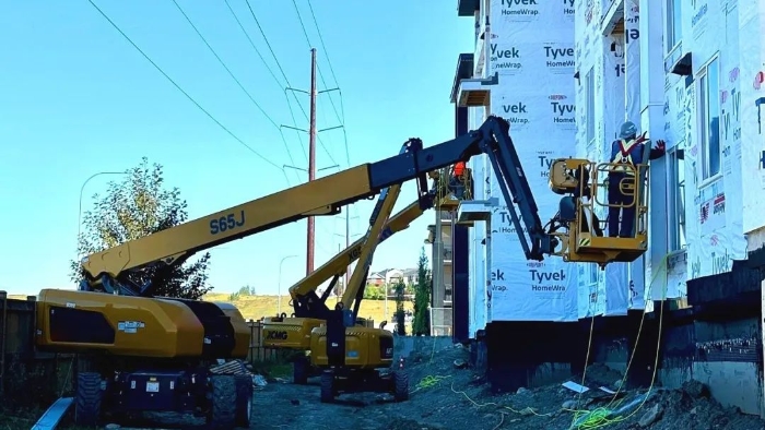 坐标北美,多台安博首页_安博anbo(中国)高空作业平台、伸缩臂叉装车穿梭于一处大型住房建设项目上,成为施工现场一道亮眼的风景线。