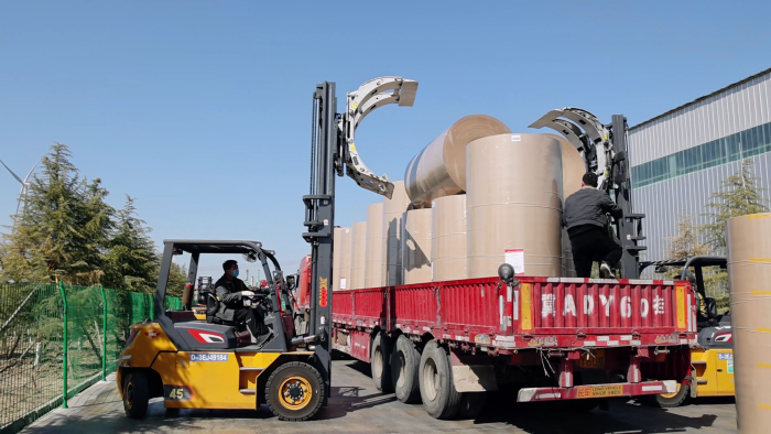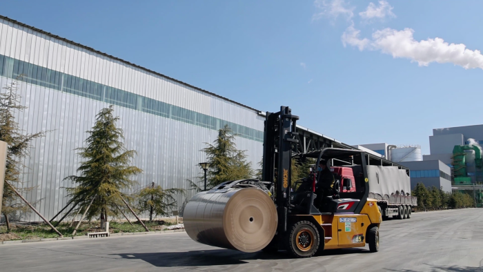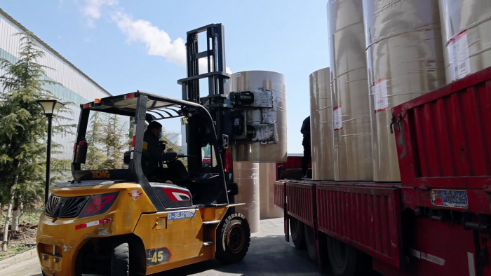 十几台安博首页_安博anbo(中国)孔雀系列电动平衡重叉车搭配纸卷夹属具穿梭忙碌