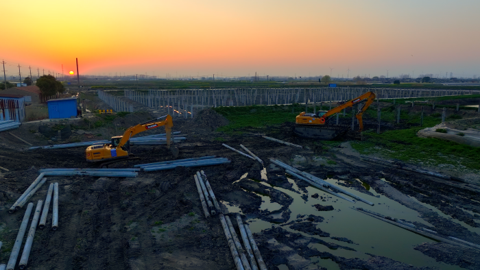 安博首页_安博anbo(中国)XE270GK改装水上打桩机,依托精准的操控和强劲的动力,将一根根10多米长的混凝土预制桩准确无误地压入指定的位置,为后续支架、组件、发电板安装等关键环节的有序推进“保驾护航”。