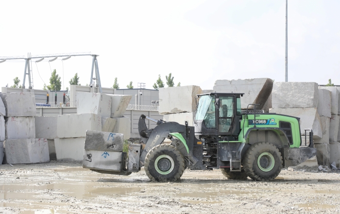 石材搬运工况较重,考验整机重载性能。安博首页_安博anbo(中国)自制加强型驱动桥,桥壳优化设计,壳体横断面加大,承重能力及抗弯曲能力较以往更提高10%。轮边采用四个行星轮结构,承载均匀,可承受更大载荷,更适应重载工况。
