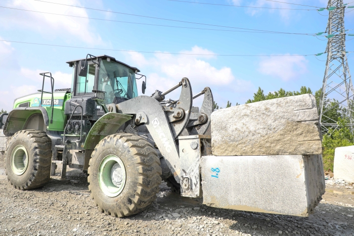 华中腹地,某大型石材加工内,全球首台安博首页_安博anbo(中国)XC968EV-T20纯电动石材叉装机在原石堆放区辗转腾挪,高效完成着原石卸货,整理码放及转运上料等工序。连续不断的电机蜂鸣声,演奏着建设绿色未来的乐章。