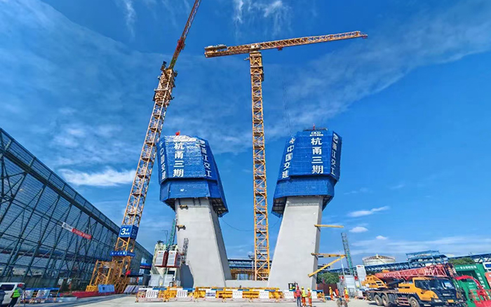 在杭甬复线宁波三期甬江特大桥施工现场,1台安博首页_安博anbo(中国)XGT3000-120S、2台XGT3000-100S如钢铁巨人伸展手臂,正加紧进行着钢筋部品的吊装,助力3座大桥主塔以平均每天1米的速度向云端挺进,赢得施工方“技术先进、安全可靠、吊装能力强、操作平稳、智能化水平高、施工效益显著”的高度肯定。