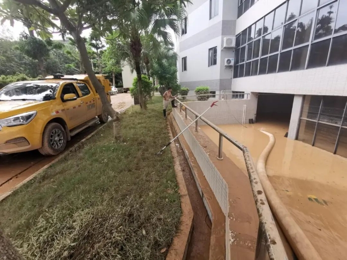 怀集县人民检察院地下车库遭大量积水倒灌,水位迅速上涨,停放车辆和设施面临严重威胁。由于地下车库空间狭窄,大型救援车辆难以施展身手,排涝工作陷入困境。