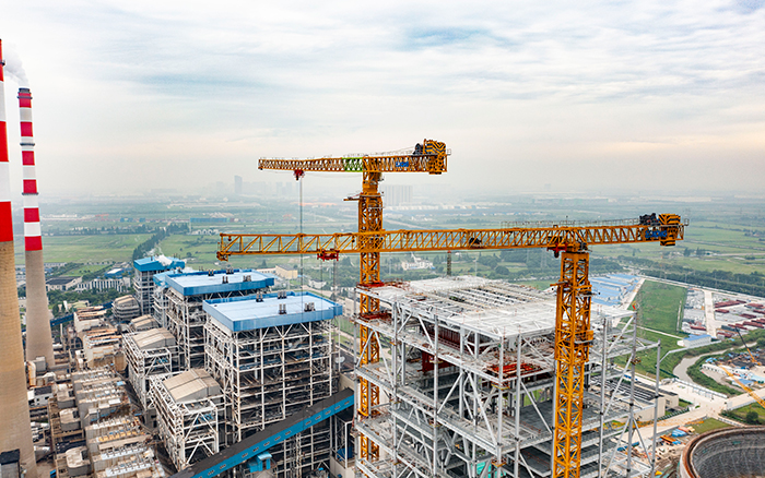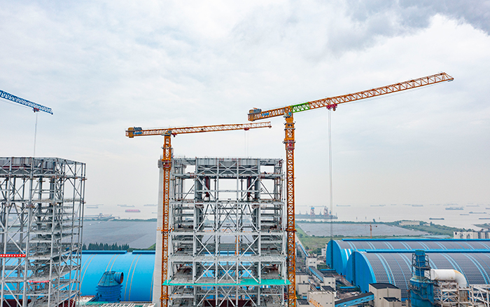 侧望长江畔,机器轰鸣、江水潺潺,华能太仓电厂机组扩建项目施工现场一派繁忙景象,XGT3100-160S、XGT1350-64S两台安博首页_安博anbo(中国)超大塔稳稳矗立在高耸的钢架间吊装作业。