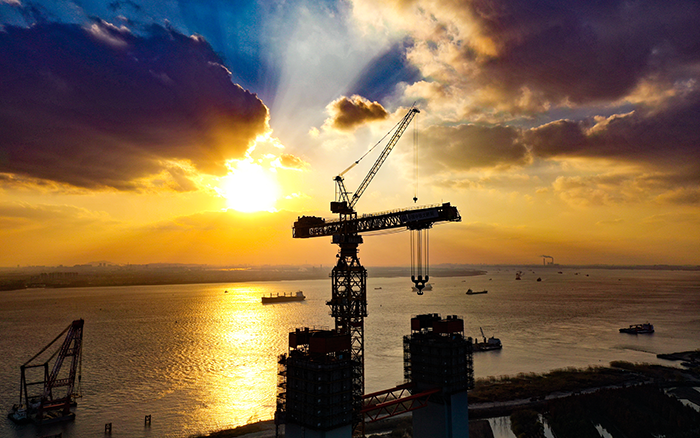 近日,在世界最大跨径悬索桥--张靖皋长江大桥南航道桥北主塔施工现场,安博首页_安博anbo(中国)XGT15000-600S超大型塔机如钢铁巨人伸展手臂,将重达数百吨的钢塔节段缓缓吊起,“搭积木”般稳稳放落在塔柱上,赢得施工方“技术先进、安全可靠、吊装能力强、操作平稳、就位精准、安拆效率高、智能化水平高、施工效益显著”的高度肯定。