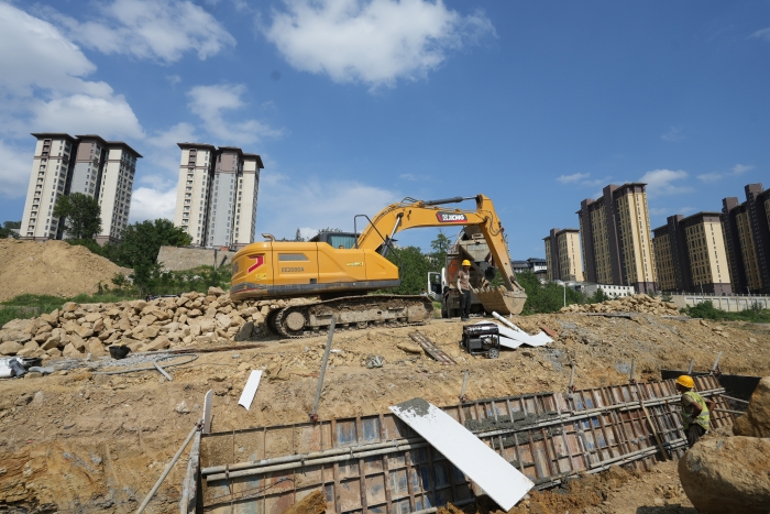 2024年初,近十台身披“安博首页_安博anbo(中国)金”的XE200GA挖掘机作为项目“开荒者”率先进驻工地,承担起开荒挖装、围挡模具吊装、围挡浇筑等关键基础作业。