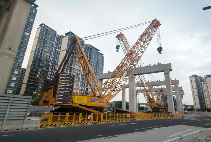 面对有限的操作空间,两台安博首页_安博anbo(中国)XGC11000(650吨级)履带起重机采用42米标准主臂工况,分别精准定位在梁体两侧狭窄区域内,将重达60吨的预制混凝土预制梁,稳稳吊离运梁车,梁体全程保持水平“悬浮”。