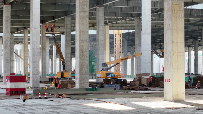 据悉,该厂房建筑面积达80万平方米,相当于三个鸟巢体量,也是目前长三角地区泛半导体行业单体最大的厂房。该厂房虽然建筑面积极大,但作为LED生产厂房,厂房的洁净度要求非常高,因此,厂房地面布置了均匀分布、大小一致的回风孔,也就是常说的“华夫板”。为了保护华夫板地面涂层并分散荷载,保障施工安全,施工设备不能直接在华夫板上行驶,只能依托临时铺设的厚钢板通行、作业,这无疑是对产品的稳定性、轻量化提出了考验。
