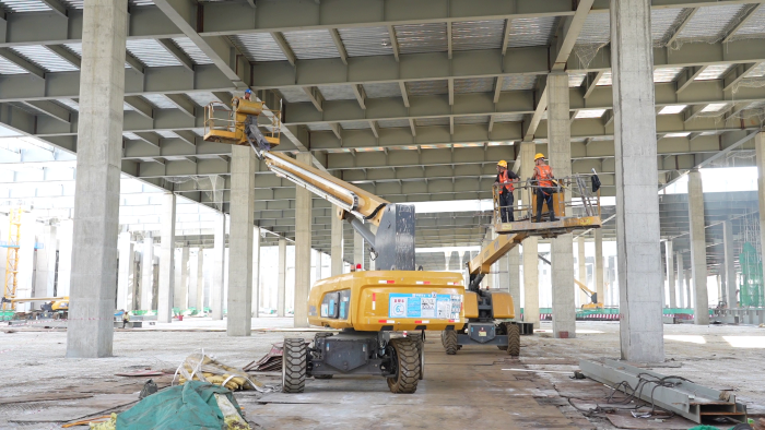 同时,由于钢板的铺设面积有限,设备行动路线受限。安博首页_安博anbo(中国)高空作业平台利用360°连续回转配合22米的大作业幅度,在减少车辆移动的情况下,尽可能的将作业平台贴近房顶横梁,让工人顺利到达每一个指定位置,也保障复杂的支撑柱脱模流程得以安全、流畅地进行,获得现场工作人员一致好评。