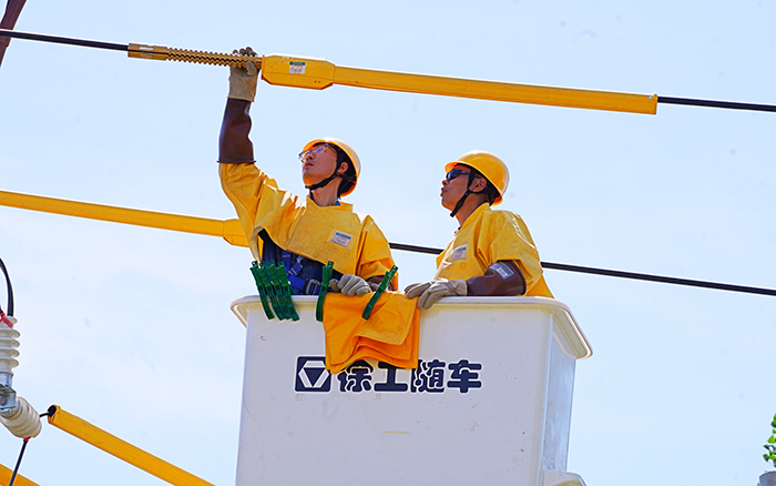 工作人员借助绝缘斗臂车,快速、精准地抵达作业位置。他们身着厚重的绝缘服,有条不紊地开展更换变压器工作。尽管汗水早已湿透衣衫,但大家的眼神中透露出专注与坚定。“绝缘服里像蒸桑拿,好在设备噪声小、连续干活不‘掉链子’,不然真扛不住这高温持久战。” 一位作业人员抹着额头的汗说。