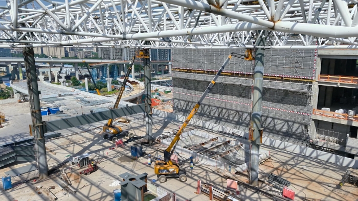 合肥西站是国内首座采用空心楼盖结构体系的智能高铁站房,施工环境复杂,屋盖钢结构的钢桁架焊接节点繁琐,平均高度24米,有一定的安装难度和安全风险。特别是在工期紧、任务重、气温高的当下,工程施工更是难上加难。