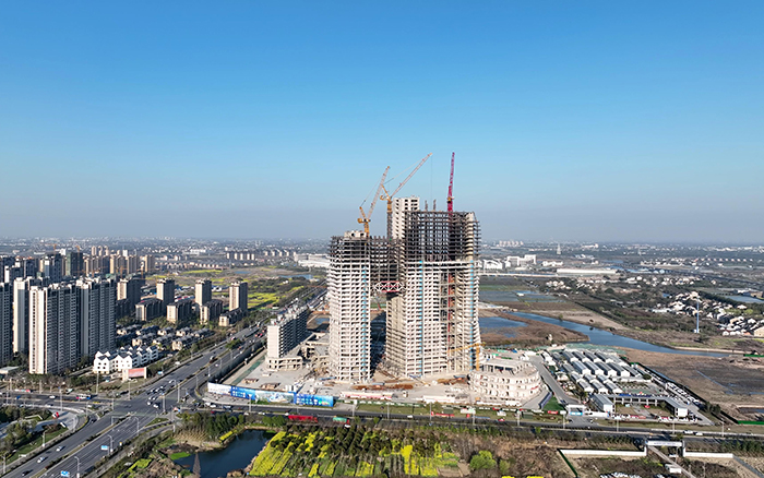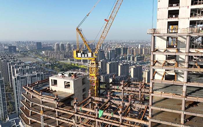 XGL630-50S凭借高效、精准的吊装性能、出色的操控微动性,克服施工现场扭转不规则、楼板不连续、尺寸突变、构件间断等问题,高效完成楼承板、钢结构和核心筒主体结构等建筑材料的吊装重任,给江南烟雨带来了一抹温暖亮丽的色彩。