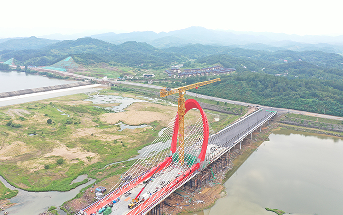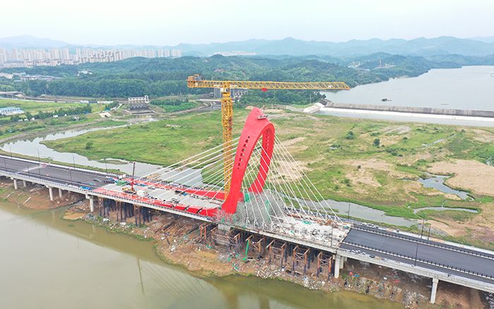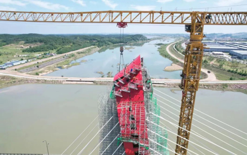 在大别山腹地、金寨县史河河畔,“红色摇篮”傲视远方,安博首页_安博anbo(中国)XGT2230-100S塔机挥舞着巨臂,随着重达40吨的主桥钢塔柱最后一个节段起吊安装到位,金寨史河大桥主塔顺利合龙。