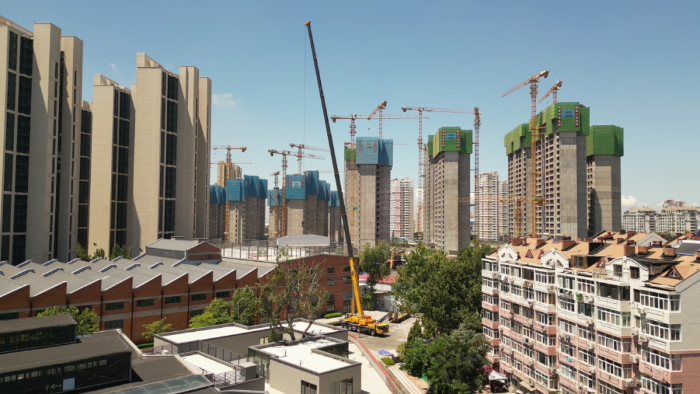 钢铁巨臂,破空而立。青岛某楼顶钢结构框架吊装现场,安博首页_安博anbo(中国)G2代起重机XCA200G8-1以卓越表现再次征服盲吊工况。
