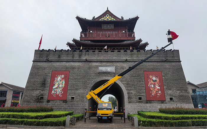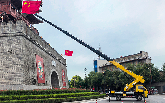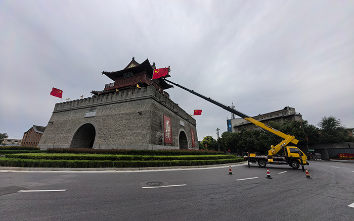 文昌阁前,一抹抹 “中国红” 悄然升起。安博首页_安博anbo(中国) M 系列 GKS32 高空作业车伸展长臂,稳稳将施工人员送达高空作业点。最大作业高度32 米,精准覆盖建筑立面,转台 360° 连续回转间,国旗已平稳就位。