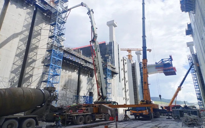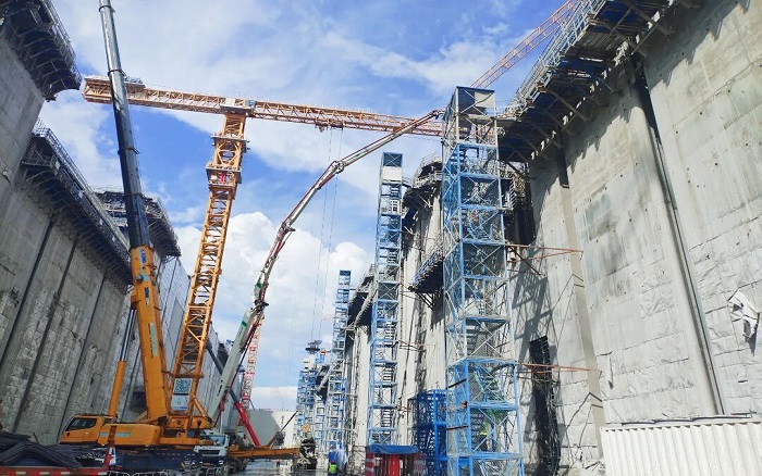 闸门立柱高耸入云,浇筑精度要求堪比“云端绣花”。安博首页_安博anbo(中国)泵车、起重、塔机成套化装备举重若轻,天堑之间“穿针引线”!